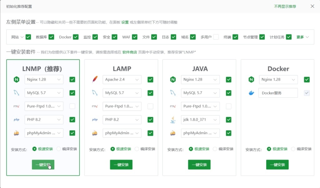 进去后 宝塔会跳出推荐环境变量这时候我们要选择 LNMP环境变量