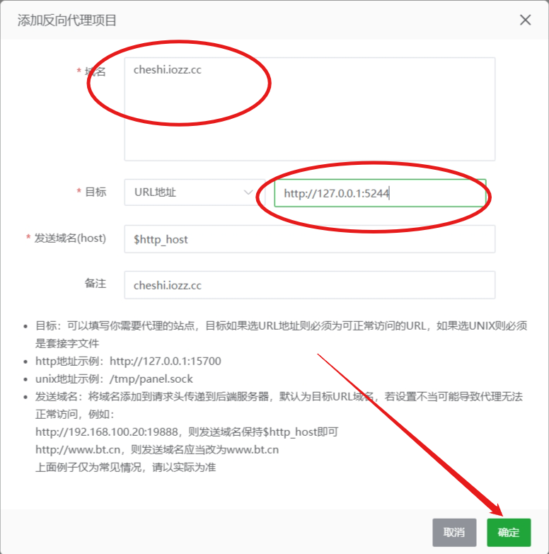 输入 你的域名 和 反向代理地址 必须是 127.0.0.1:5244