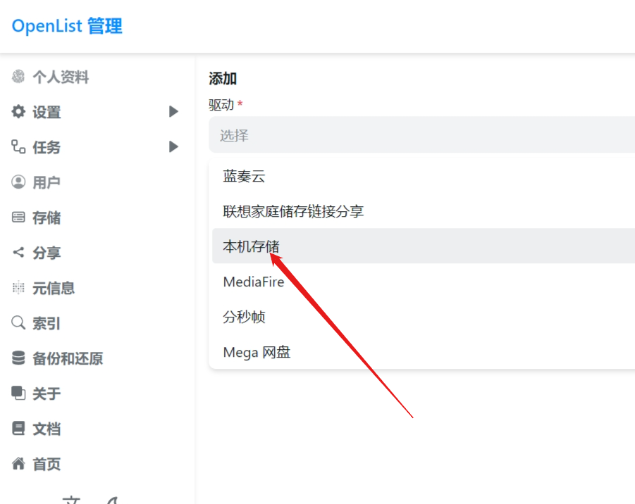 下滑找到本机存储(也可以通过openlist文档添加其他存储 OpenList 文档 )