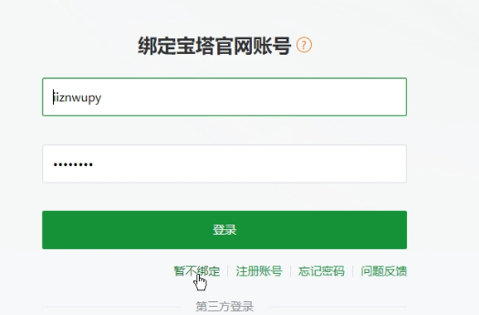 进去后需要绑定宝塔账号(最好注册一个可以领一张商业ssl证书) 没有的小伙伴直接点击暂不绑定就行了