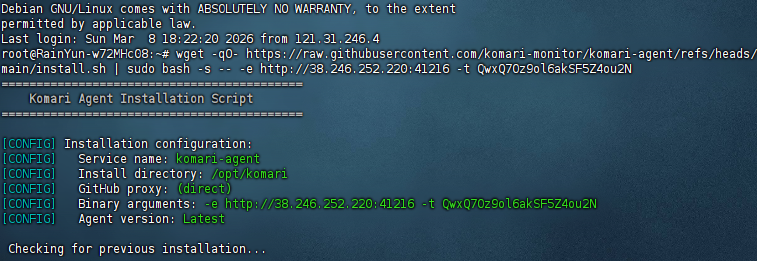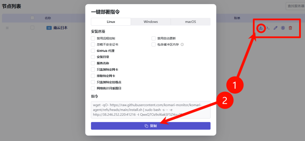 随后返回Komari Monitor 我们点击下载箭头复制一键部署命令