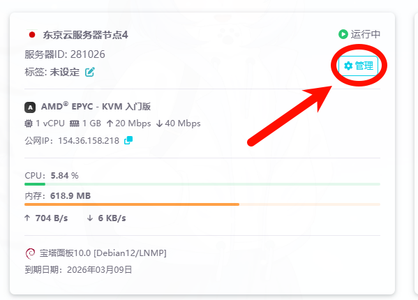 然后我们回到雨云 找到自己的云服务器点击管理