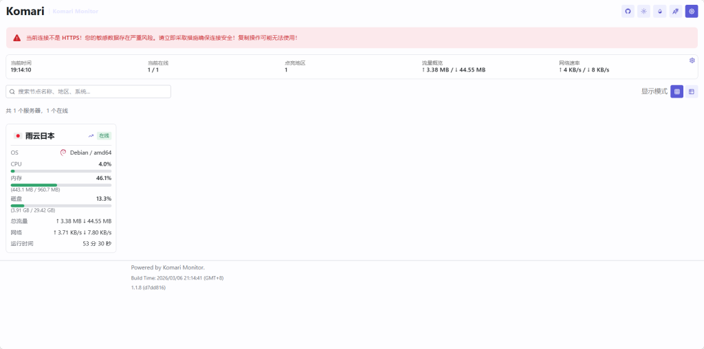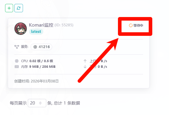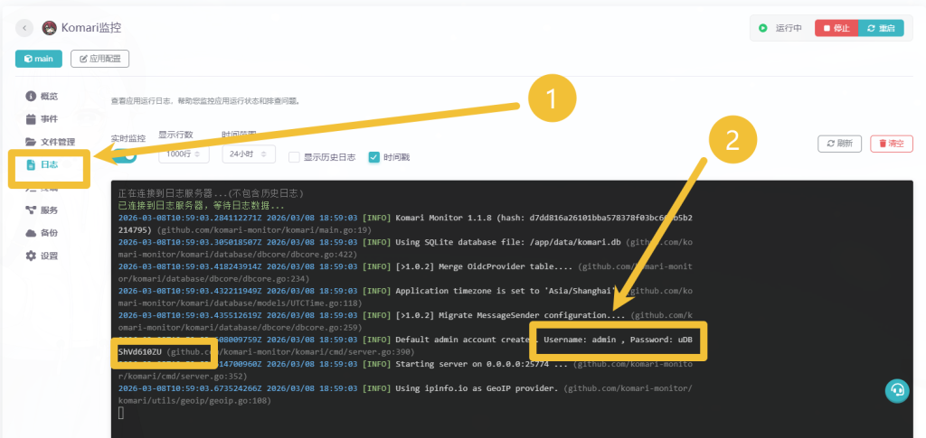 搭建完成后我们点击进入Komari监控 然后点击日志 找到 类似
