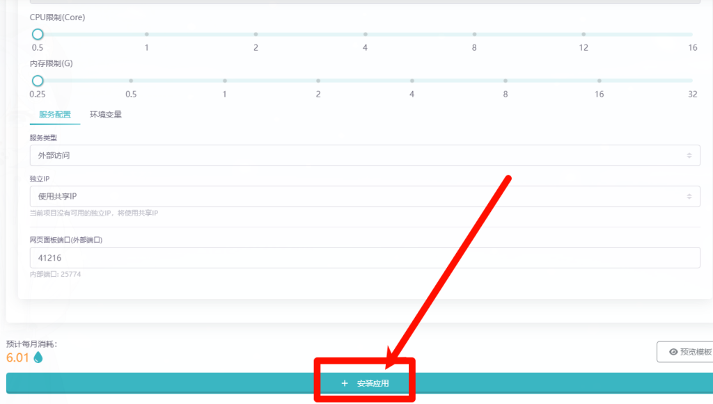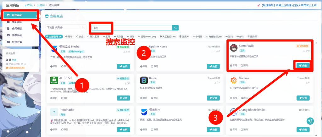 点击应用商店 然后搜索监控 点击带有官方合作的 Komari监控 点击安装