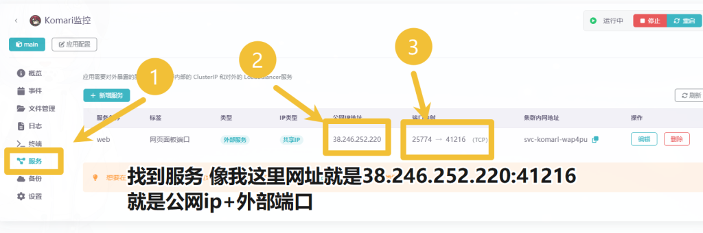 随后我们点击服务 找到公网ip+外部端口打开