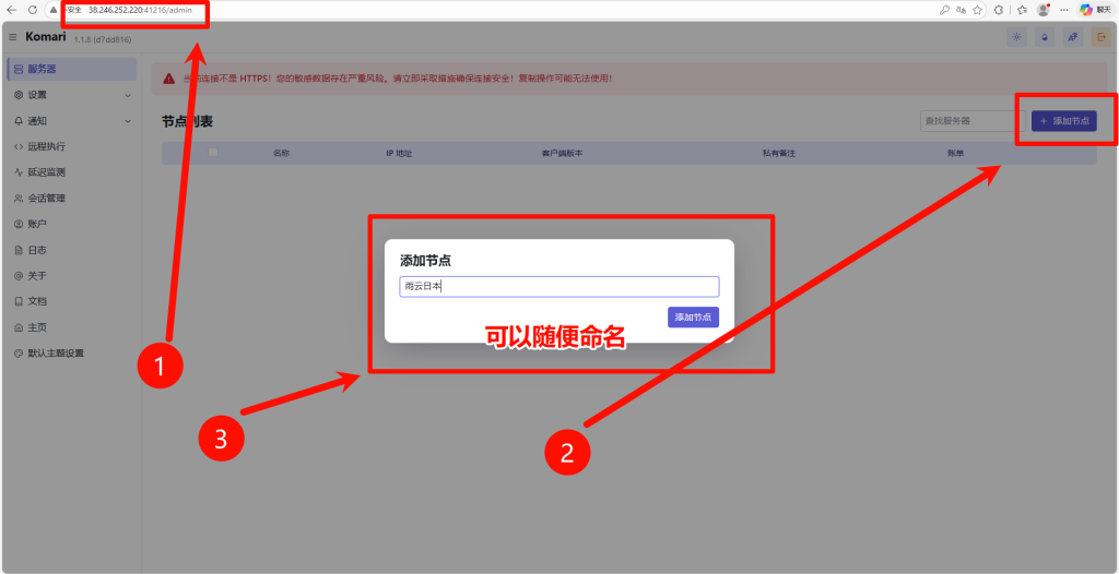 我们打开后台 点击服务器 点击添加节点 输入名称(可以随便填写 方便记忆即可)